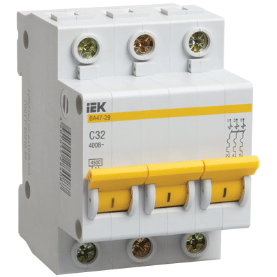 Автомат IEK 3Р С40А - трехполюсные модули автоматического включения, обеспечивающие защиту электроцепи от коротких замыканий тока и перегрузок, номинальный ток - 100А, отключающая способность - 6кА, размер - 3 модуля