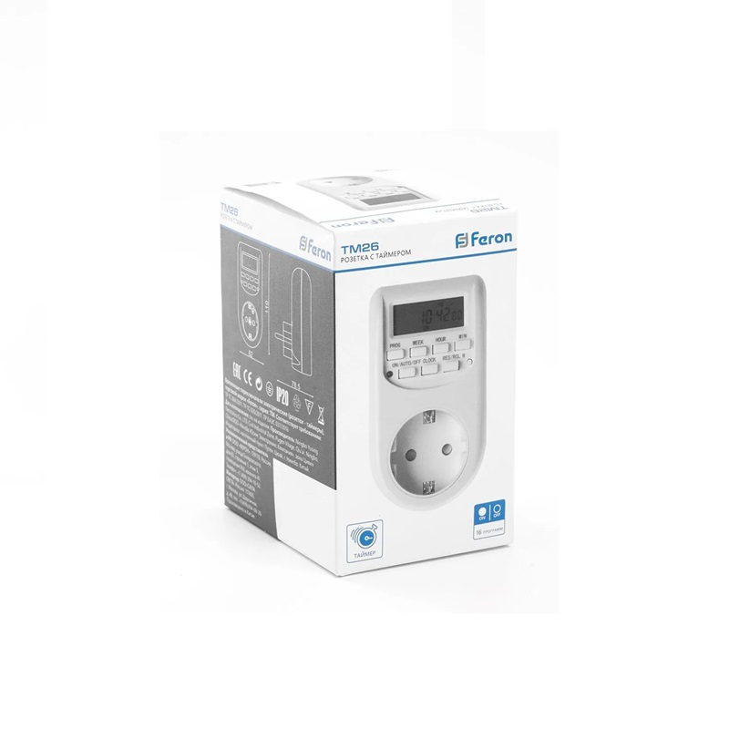 Розетка 1-местная с таймером Feron TM26 41815, на неделю, электронное управление, белая имеет 15 различных комбинаций дней недели и 16 доступных программ автоматического включения/выключения обеспечат автономную работу электроприборов и освещения в квартире или загородном доме.