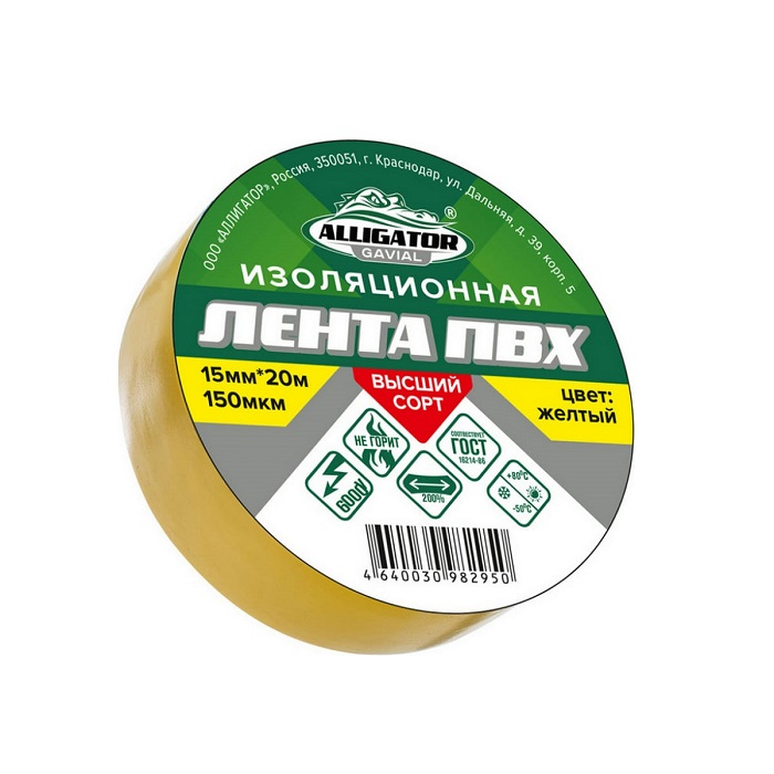 - Изолента ПВХ Alligator Gavial 15мм*20м Желтая