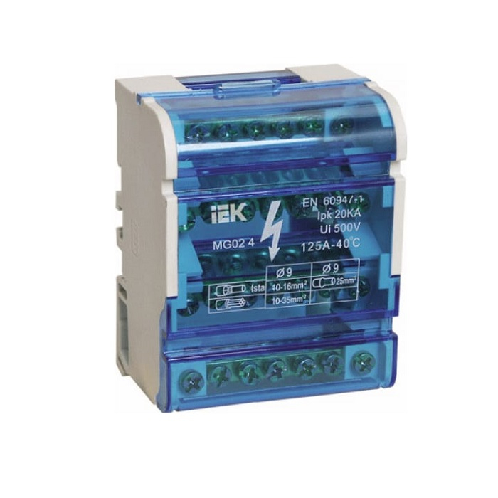 Нулевая шина в корпусе используется для подсоединения нулевого провода, провода заземления и фазных проводников. Шина изготовлена из латуни, которая обеспечивает долгий срок службы изделия. Защитная крышка и изолирующая задняя панель выполнены из самозатухающего пластика. Устанавливается на DIN-рейку на панель щита с помощью двух винтов.