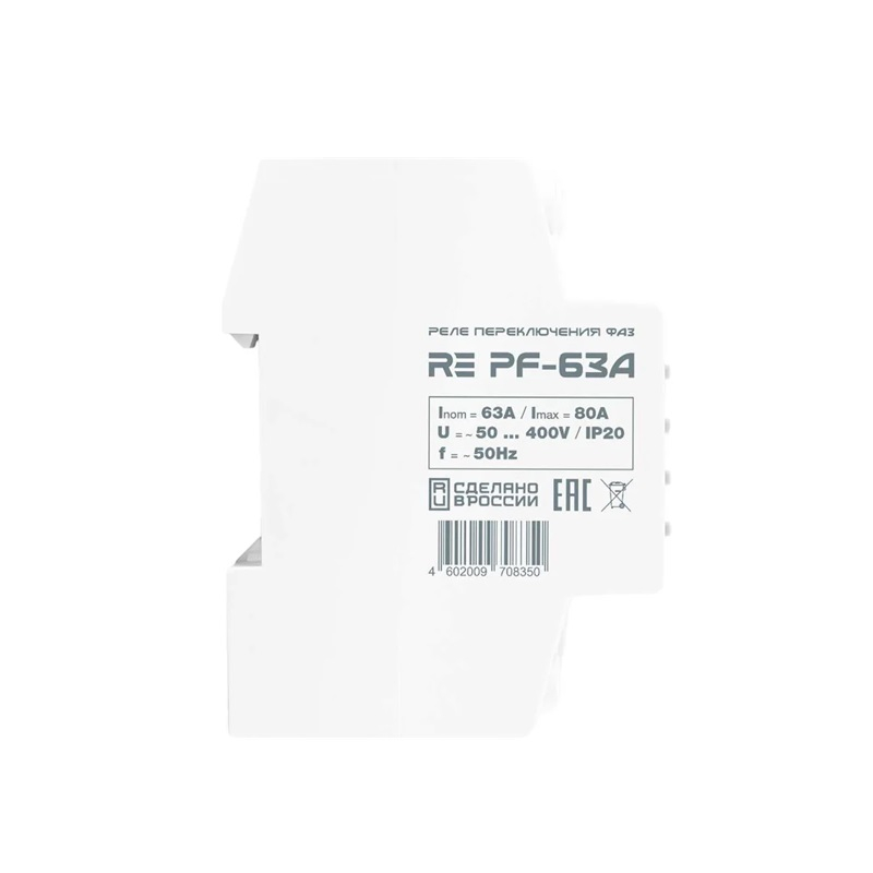 Реле переключения фаз RE RF-63А предназначено для подключения промышленных и бытовых потребителей от одной из фаз трехфазной сети, с целью обеспечения питания особо ответственного однофазного оборудования от наиболее качественной фазы и защиты его от повышенного и пониженного напряжения.
