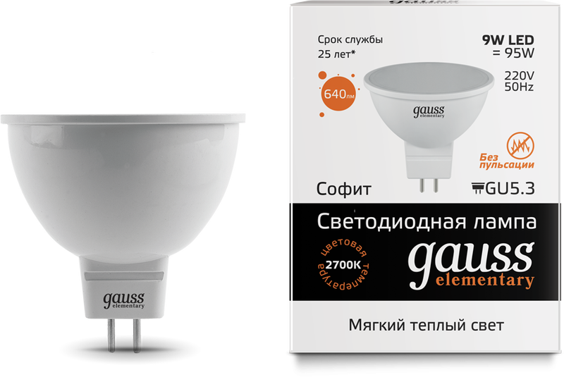 Технические характеристики лампы LED софит 9w GU5,3 3000К GAUSS Elementary