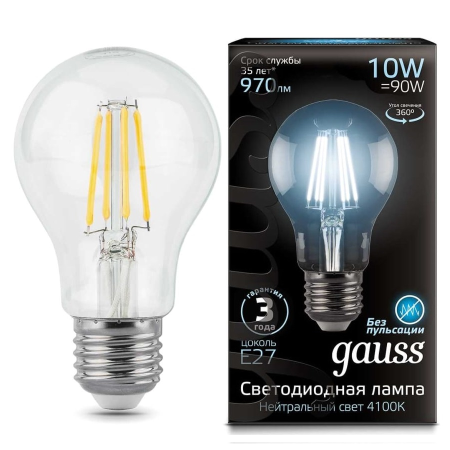 Описание лампы светодиодной GAUSS Filament A60 E27 10Вт 4100К