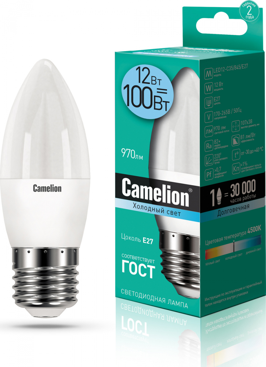 Описание светодиодной лампы свеча Camelion LED12-C35/845/E27 12Вт 4500К