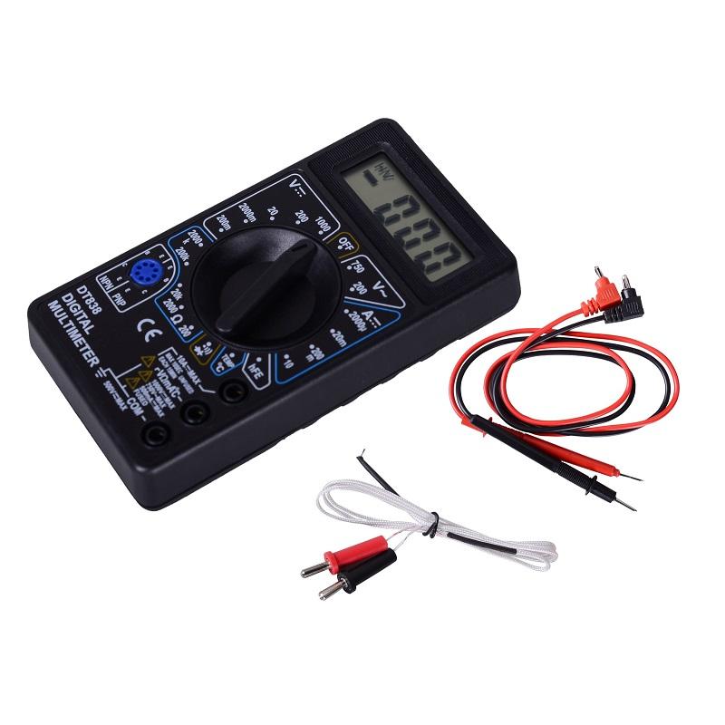 Мультиметр TEK DT 838 используется для измерения напряжения, силы тока, сопротивления, емкости, проверки диодов и транзисторов, прозвонки цепи. Подходит для использования в полевых условиях, лабораториях, домашних мастерских. Цифровой дисплей с крупными цифрами отражает полученные данные. Модель оснащена удобным переключателем режимов работы и пределов. Также стоит отметить высокую чувствительность - 100 мкВ. Приобор автономен, работает от батареи "Крона" 9В, вес составляет 180 г.