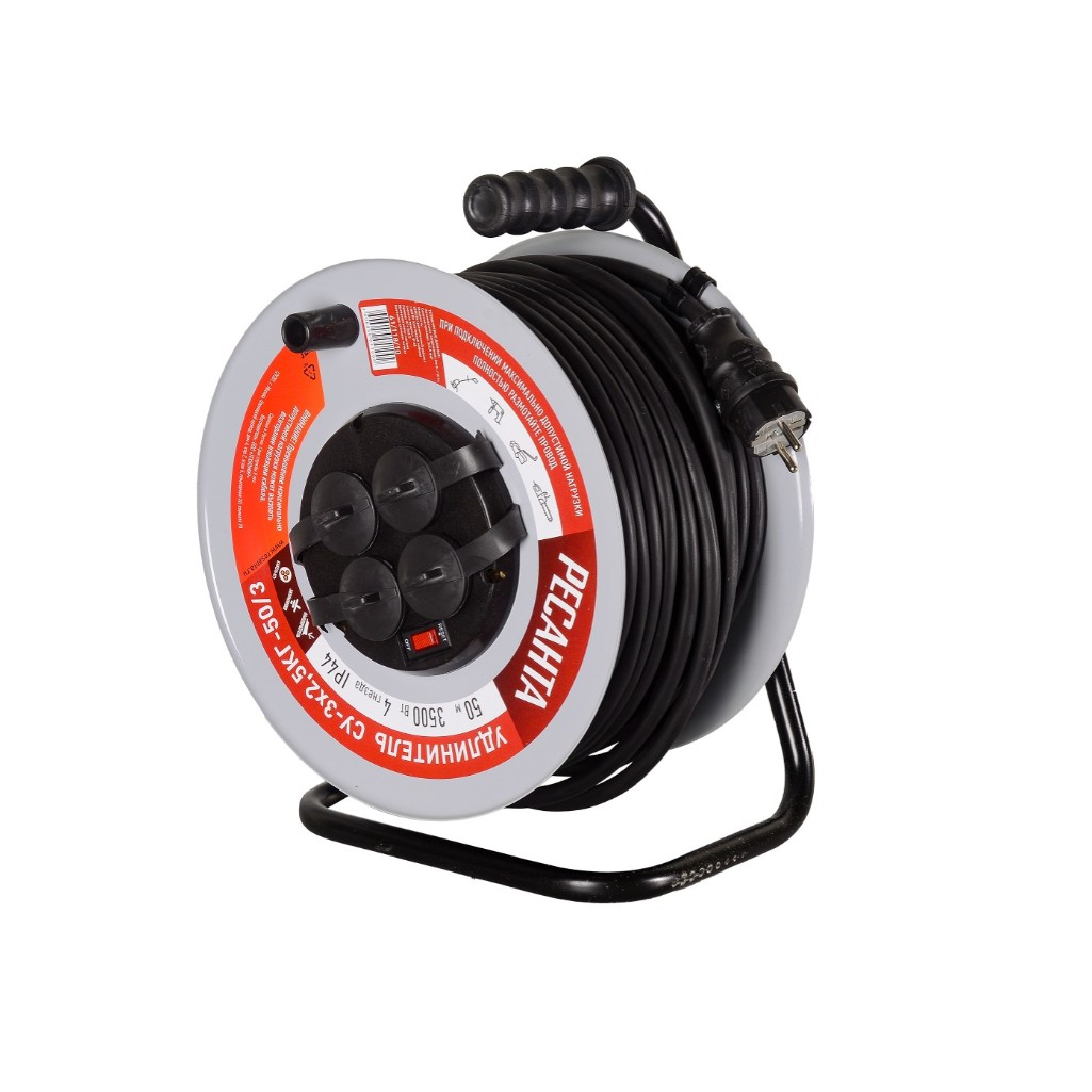 - Удлинитель силовой на металлической катушке, СУ-3х2,5КГ-50/3 (с выкл., 4 розетки, IP44) Ресанта