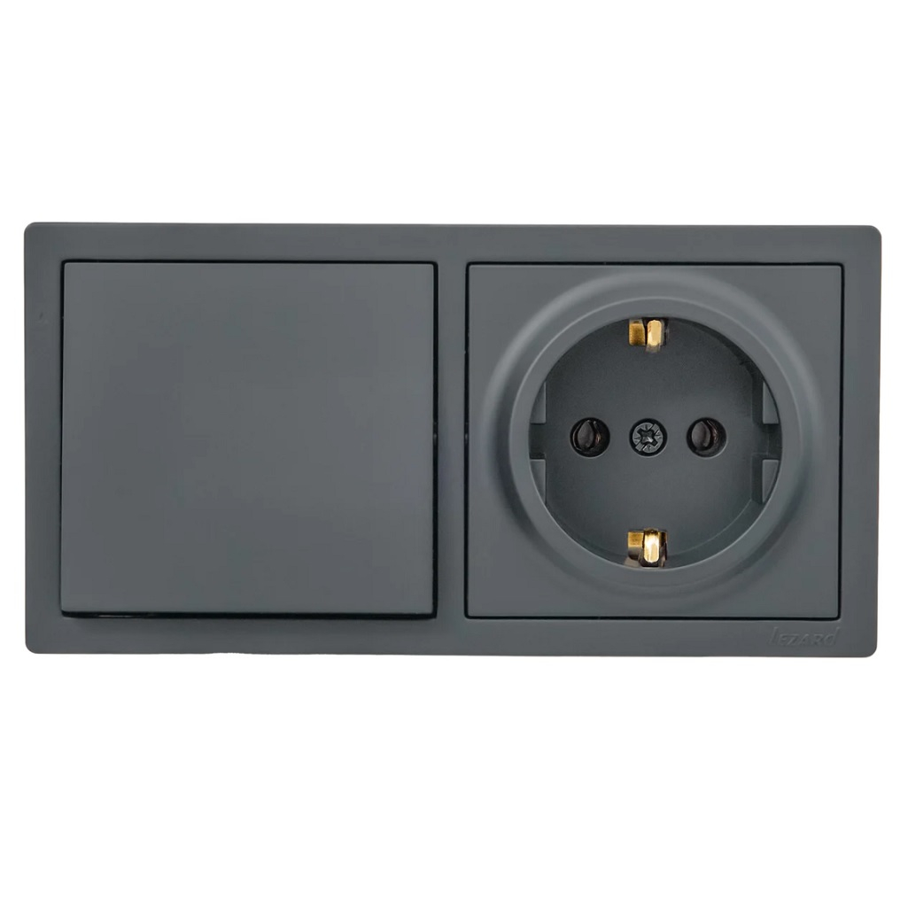 Выключатель и розетка Lezard Leto с заземлением, накладной монтаж, графит - комбинированное устройство для горизонтального монтажа. Заземление в розетке обеспечивает защиту от электрических ударов и коротких замыканий. Устройство имеет стильный и минималистичный внешний вид, что делает его подходящим для большинства интерьеров. Простота монтажа позволяет легко установить блок с минимальными усилиями.