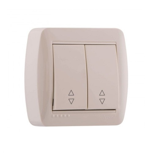 Выключатель бытовой проходной 2-клавишный открытой установки. Выполнен в кремовом цвете.