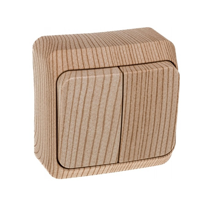 Выключатель Этюд 2-кл ОУ сосна - предназначен для включения и отключения освещения тока в цепи бытовых осветительных приборов. Применяется для установки с открытой проводкой. Подходит для большинства типов ламп, включая энергосберегающие и люминесцентные лампы