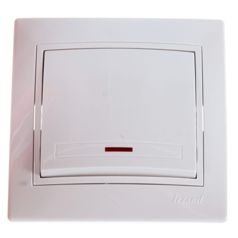 Выключатель LEZARD с подсветкой ОУ белый - выключатель, изготовленный из высокопрочных и негорючих материалов. Предназначен для включения и отключения осветительных устройств. Тип монтажа открытый. Защита IP-20 ознчает, что во внутарь выключателя не поподает влага и пыль, номинальный ток 10А. Цвет - Белый