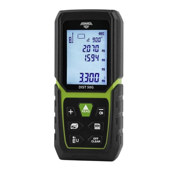 Лазерный дальномер AMO DIST 50G 857386 оборудован встроенным инклинометром и способен выполнять не только линейные измерения в диапазоне от 5 мм до 50 м, но определять величину углов относительно горизонтальной плоскости в пределах ±90°. Измерения могут выполняться как с руки, так и с любого штатива с четвертьдюймовой резьбой, для чего прибор снабжен соответствующим креплением, поддерживает функции изменения начальной точки отсчета и задержки измерений.