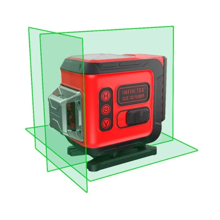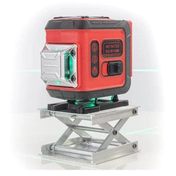 Лазерный нивелир Infiniter CLG 3D FLOOR самовыравнивающийся строительный аппарат, он проецирует две вертикальные и одну горизонтальную плоскости с углом развертки 360° с лучом зеленого цвета.