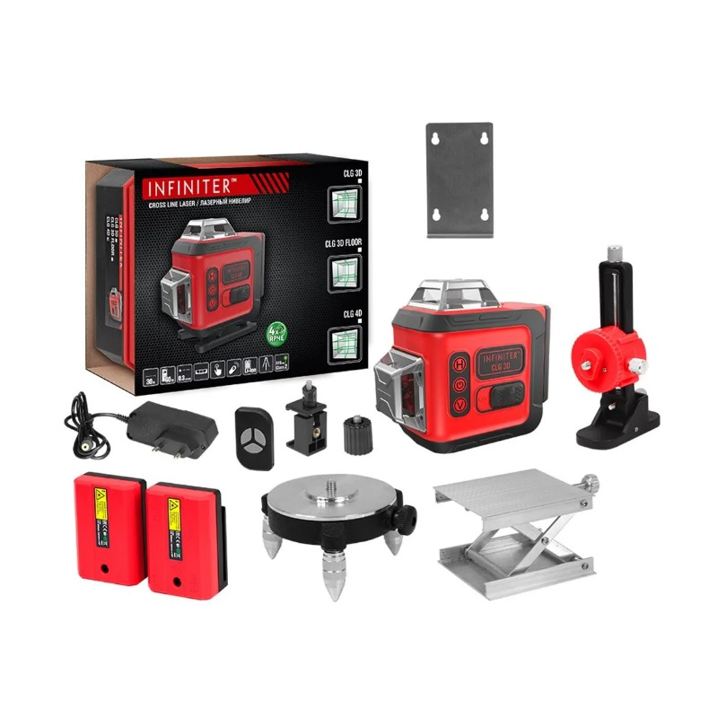 Infiniter CLG 3D оснащен встроенным пузырьковым уровнем, что позволяет дополнительно контролировать точность выравнивания. В комплекте идет удобный пластиковый кейс для хранения и транспортировки, а также набор дополнительных аксессуаров, которые расширяют функциональность прибора.