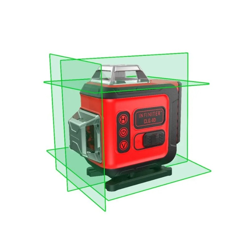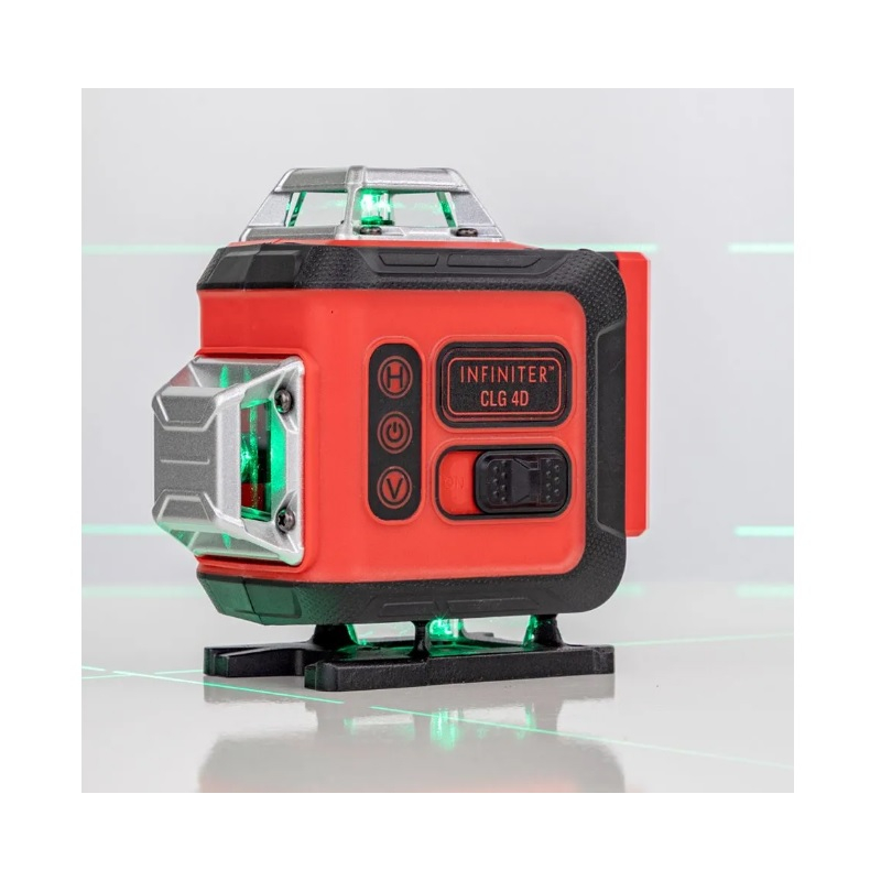 Лазерный нивелир Infiniter CLG 4D new самовыравнивающийся строительный аппарат, он проецирует две вертикальные и две горизонтальные плоскости с углом развертки 360° с лучом зеленого цвета.