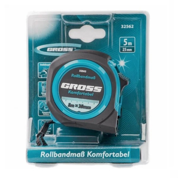 Рулетка Gross 5 м, 25 мм 32562 - это надежная рулетка, которая оснащена обрезиненным корпусом и лентой длиной 5 м, при ширине 25 мм . Инструмент удобно хранить в кармане и он всегда будет под рукой для проведения измерительных работ. Рулетка помогает выполнить линейные измерения ровных поверхностей, различных заготовок и деталей, материалов, конструкций и расстояний.