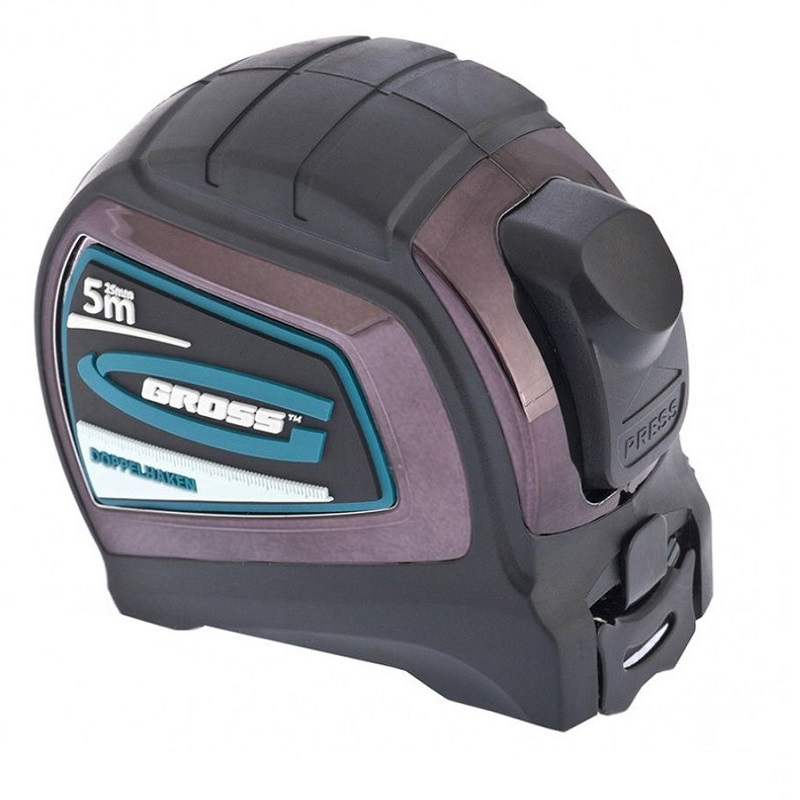 Рулетка Doppelhaken GROSS 5х25 - торговой марки GROSS с длиной ленты 5 м и шириной 25 мм. Сочетание ABS-пластика и термопластичной резины позволяет сохранить работоспособность при резких изменениях температуры, а также при падении с высоты до 1,5 м. Измерительное полотно с двухсторонним зацепом имеет дополнительное покрытие нейлоном, защищающее металлическое полотно от истирания и воздействия окружающей среды. Возвратная пружина из углеродистой стали обладает необходимой упругостью и долговечностью. Рулетка имеет автоматическую фиксацию измерительного полотна