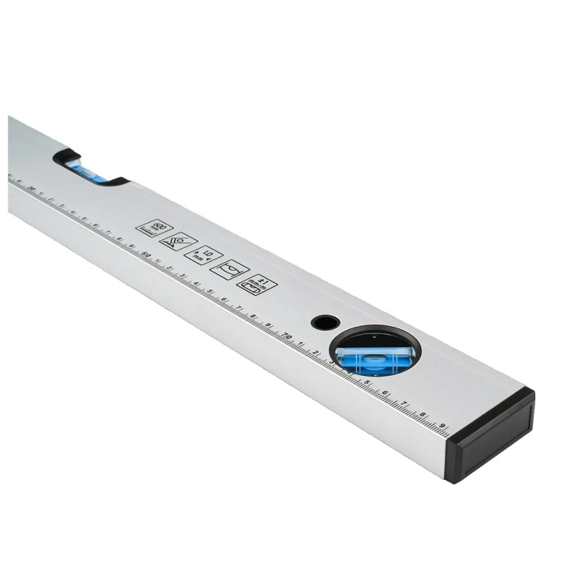Модель изготовлена из алюминиевого профиля прямоугольного сечения с пластиковыми заглушками по бокам. Инструмент оснащен тремя капсулами с разным угловым положением, заполненными незамерзающим раствором синего цвета, в котором воздушный пузырек хорошо различим даже при слабом освещении и при выполнении работ в защитных очках.
