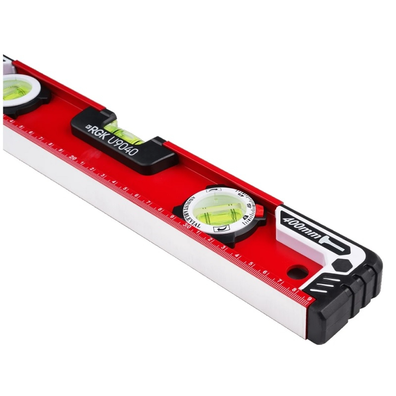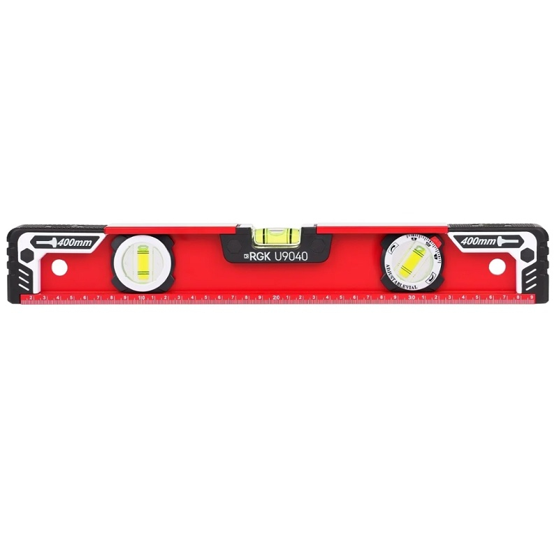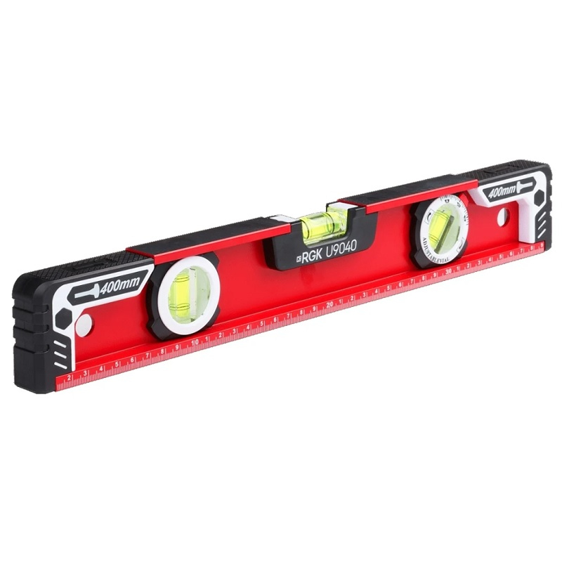 Уровень RGK U9040 400 мм применяется в сфере строительства и ремонта для определения отклонений по горизонтали и вертикали. Эта модель имеет три глазка, а также магнит для крепления инструмента на металлической поверхности. Есть линейка с шкалой, благодаря чему мастер может выполнять разметочные работы.