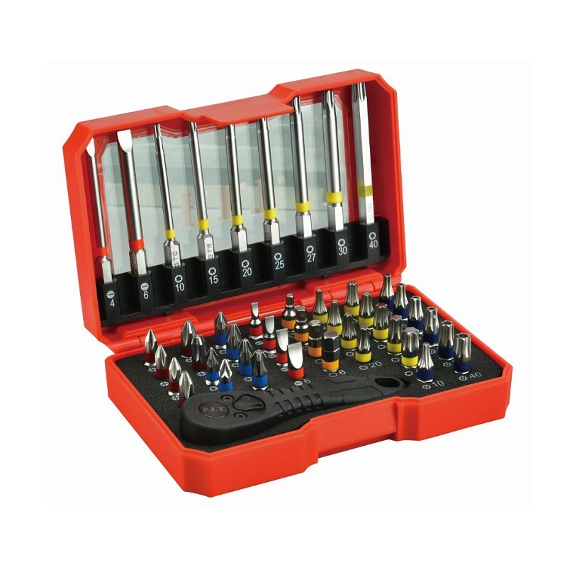 Набор бит P.I.T. 46 шт предназначен как для тяжелых нагрузок при работе ударными винтовертами и шуруповертами, так и для стандартных работ с крепежом разного вида. Биты оснащены торсионной зоной, для работы с высокими крутящими моментами и в режиме тангенциального удара. Кроме того, снижается давление на наконечник биты и снижается риск поломки, что значительно увеличивает ресурс оснастки.