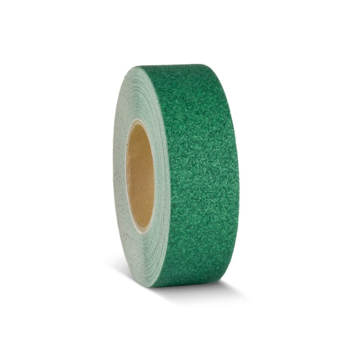 Лента самоклеящаяся Anti Slip Systems, зеленый состоит из качественной подложки на основе ПВХ или полиэстера с нанесенной на лицевую сторону абразивной крупной крошкой из карборунда или оксида алюминия. Полученная таким способом шероховатая поверхность наподобие шкурки эффективно препятствует скольжению, защищая человека от падения. На вторую сторону наносится мощный долговечный акриловый, модифицированный акриловый или каучуковый клей, который позволяет удерживать ленту практически на любых непористых поверхностях — гладкий бетон, мрамор, гранит и керамогранит и т. д.