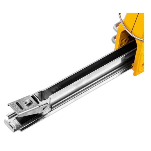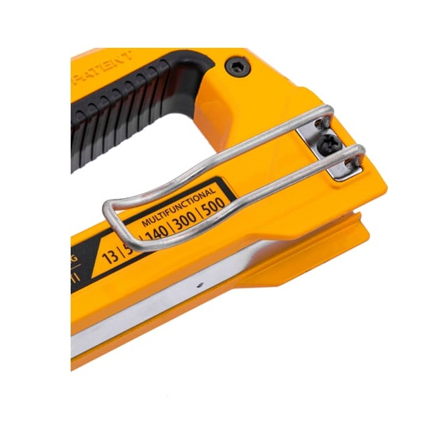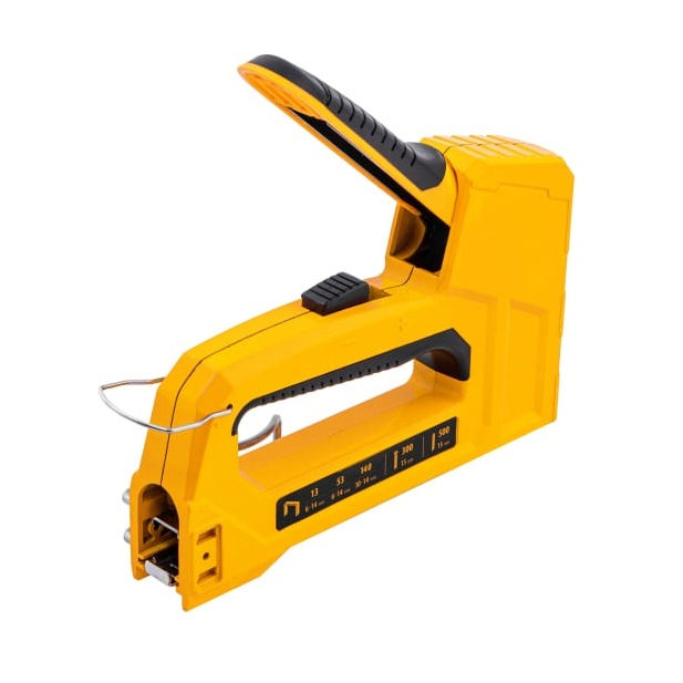 Степлер DENZEL 40215 тип 53/13/140, 6-14 мм совместим со скобами 13 и 53 типа длиной 6-14 мм, 140 типа длиной 10-14 мм, гвоздями 300 типа и штифтами 500 типа длиной 15 мм используется для крепежных работ с листовыми материалами из фанеры, картона, ДВП, ДСП, оргалита, а также с пленкой и теплоизоляционными материалами. Функция двухпозиционной регулировки силы удара позволяет работать с тонкими материалами. При помощи выступающего носика можно забивать скобы в труднодоступных местах. Степлер оснащен механизмом быстрой загрузки скоб. Корпус изготовлен из алюминиевого сплава. Скоба для фиксации рукоятки в транспортировочном положении.