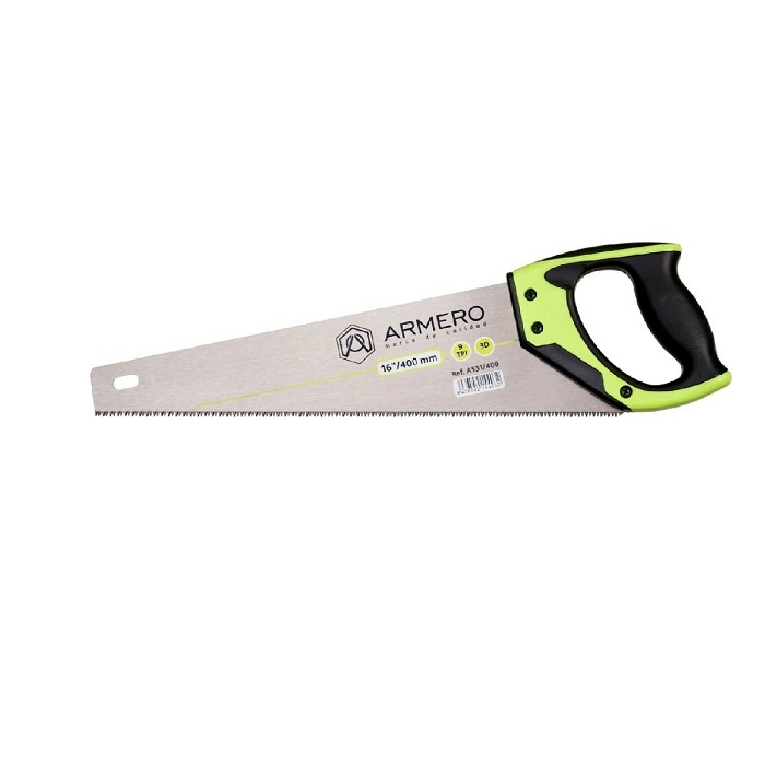 Ножовка по дереву ARMERO A531/400 c длиной полотна 400 мм с размером зубьев 9TPI (9 зубьев на дюйм). Полотно выполнено из стали SK5 толщиной 1 мм для большей жесткости, закаленные зубья имеют лазерную 3D заточку. Рукоятка имеет эргономичную конструкцию, выполнена из трехкомпонентного материала и закреплена на полотне с помощью винтов – для оптимальной безопасности и комфорта в работе.