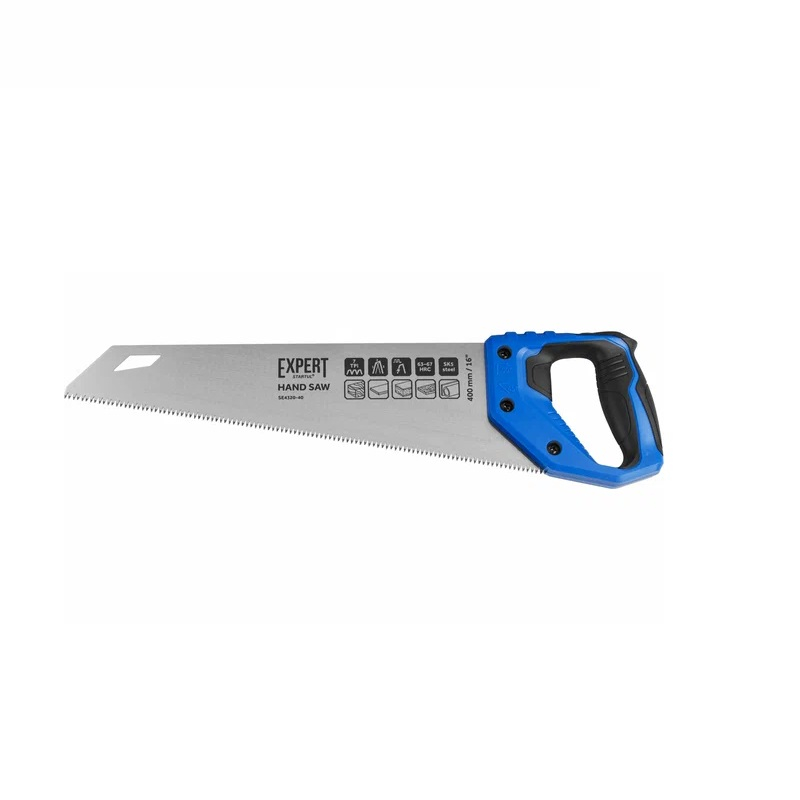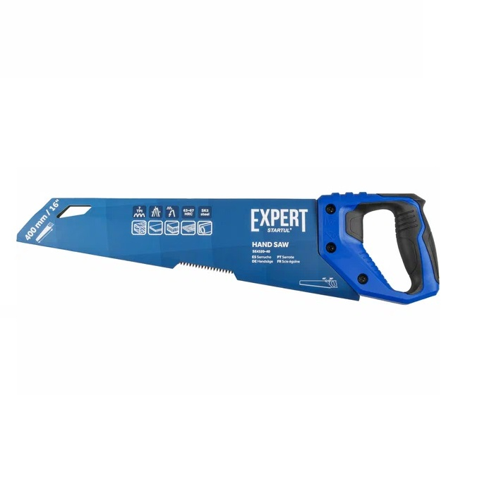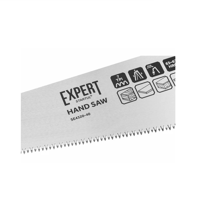 Ножовка по дереву EXPERT STARTUL SE4320-40 400 мм используется при продольном и поперечном пилении древесины и ПВХ. Зубья имеют импульсную закалку с трехгранной заточкой. Полотно выполнено из японской высокоуглеродистой стали SK5. Рукоятка двухкомпонентная, изготовлена из ударопрочного обрезиненного пластика и крепится тремя винтами к полотну.
