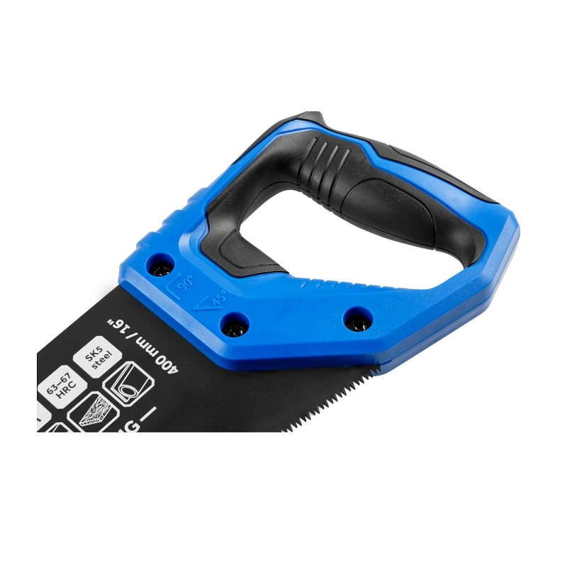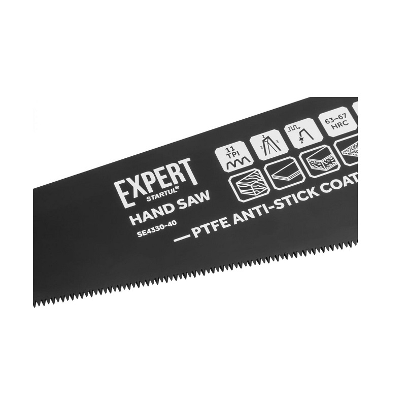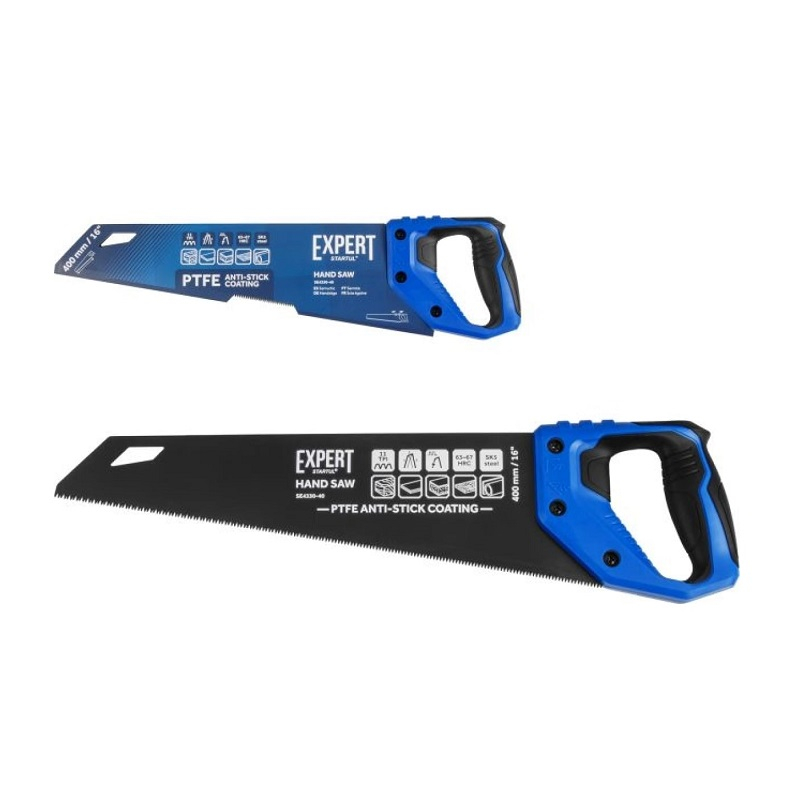 Ножовка по дереву EXPERT STARTUL SE4330-40 400мм используется при продольном и поперечном пилении древесины и ПВХ. Зубья имеют импульсную закалку с трехгранной заточкой. Полотно выполнено из японской высокоуглеродистой стали SK5 с тефлоновым покрытием. Рукоятка двухкомпонентная, изготовлена из ударопрочного обрезиненного пластика и крепится тремя винтами к полотну.