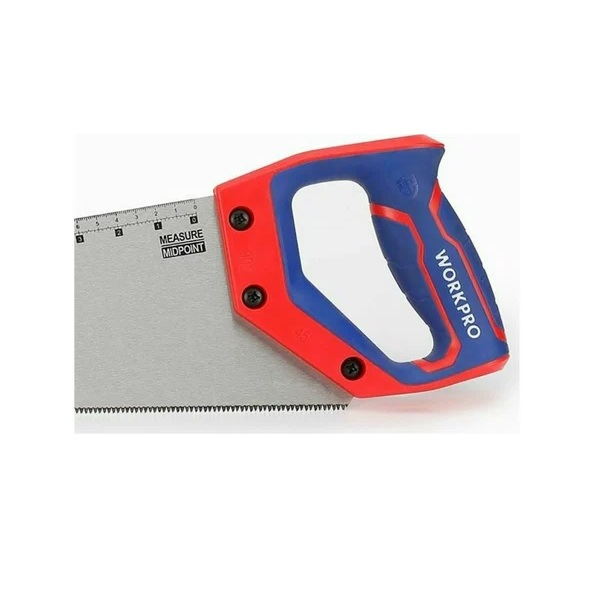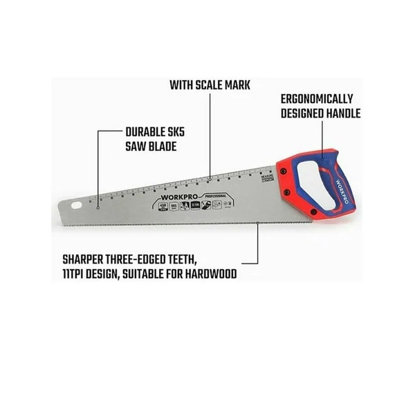 Ножовка по дереву Workpro 450мм подходит для быстрой резки дерева, ПВХ и других материалов. Пильное полотно выполнено из высокопрочной стали SK5, что обеспечивает долговечность и прочность.