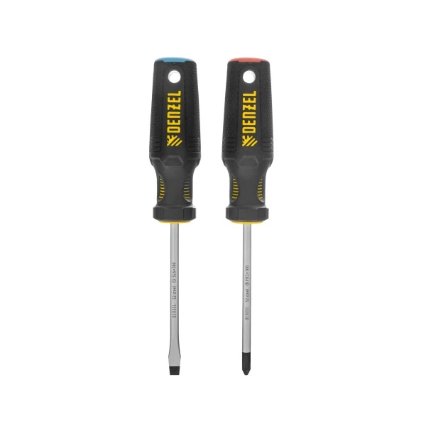 Набор отверток DENZEL 2шт 122117 состоит из 2 отверток со шлицами PH2, SL6 при длине стержней 75 мм, изготовленных из стали S2 и оснащенных трехкомпонентными рукоятками.