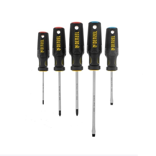 Набор отверток DENZEL 5шт 122157 состоит из 5 отверток оснащенными трехкомпонентными рукоятками и стержнями изготовленными из стали S2, используется для монтажа или демонтажа резьбового крепежа со шлицами типа SL и PH.