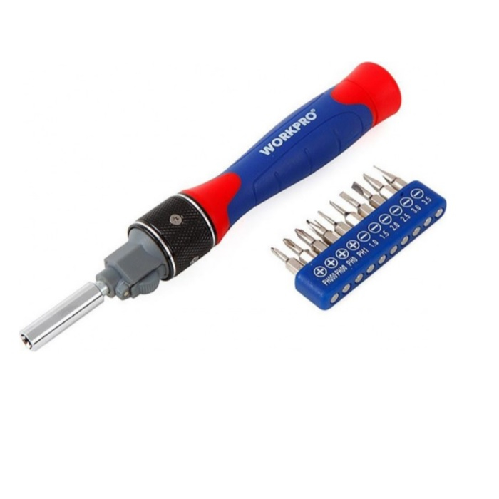 Отвертка Workpro реверсивная проста и удобна в использовании. Отлично подходит для выполнения точных работ с мелким крепежом. В комплект входят 11 насадок разных размеров и форм, что позволяет использовать их для работы с различными видами крепежа. Также имеет трещоточный механизм.