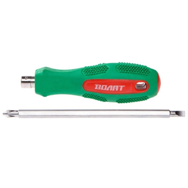 Отвертка ВОЛАТ двухсторонняя оснащена профилированной рукояткой. При большом усилии ладонь не проскальзывает при вращении. Стержень также имеет высокую прочность и не гнется. Надежное соединение с рукояткой исключает срыв и повышает надежность конструкции.