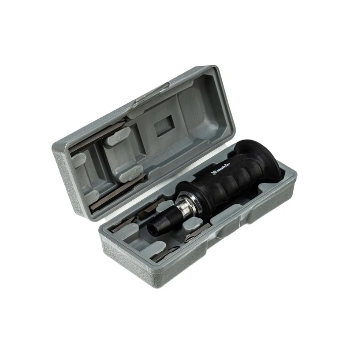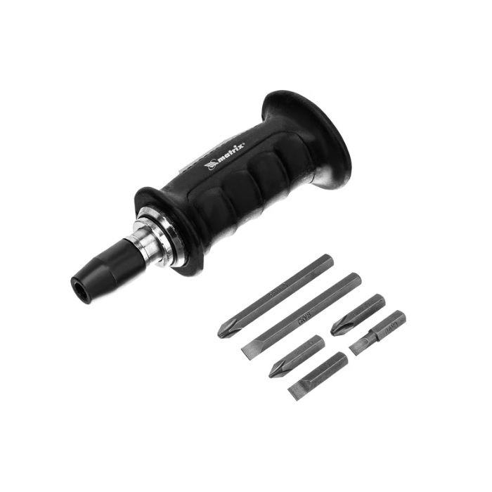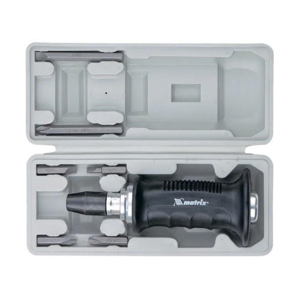 Отвертка ударно-поворотная Matrix 11561 - это ударно-поворотная наборная отвертка с ручкой черного цвета, с присоединительным шестигранником 1/2" и набором из 6 бит, поставляется в пластиковом кейсе и используется для работы с резьбовыми соединениями, для демонтажа перетянутых или заржавевших соединений и крепежей.