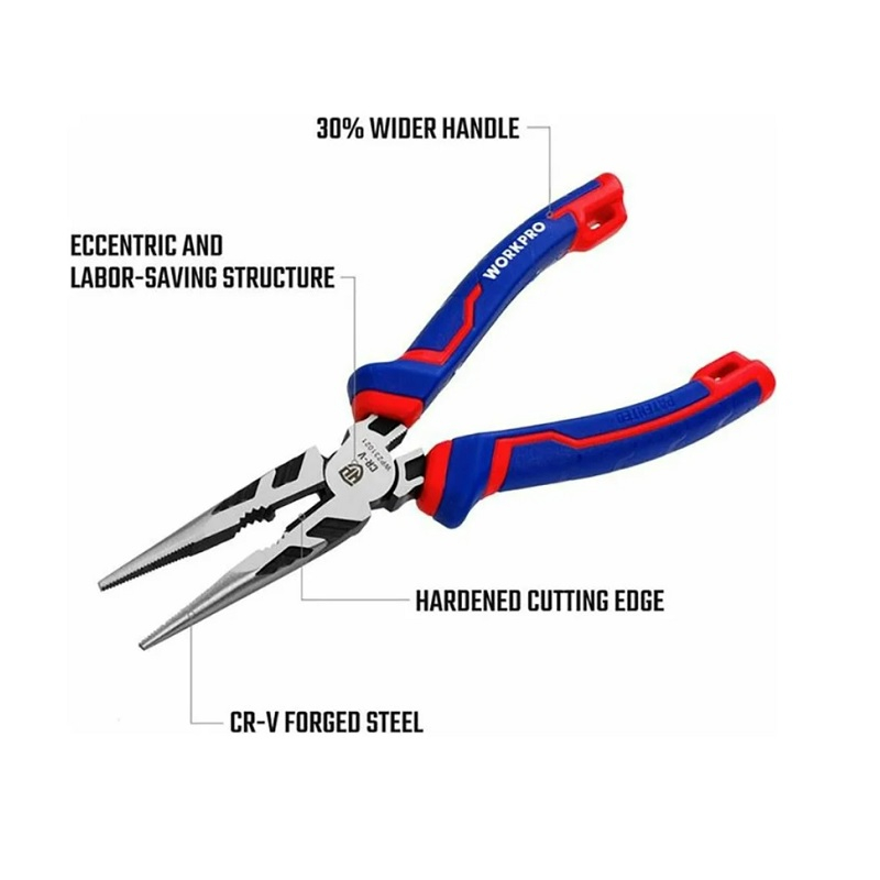 Длинногубцы Workpro 160 мм, 6 дюймов используются для различных монтажных, ремонтных и слесарных работ. Эргономичные трехкомпонентные рукоятки обеспечивают надежный хват и не скользят в руках. Инструмент изготовлен из кованой хромованадиевой стали. Материал отличается высокой прочностью и долговечностью. Инструмент можно использовать как съемник проволоки, а также для вытягивания кабеля.