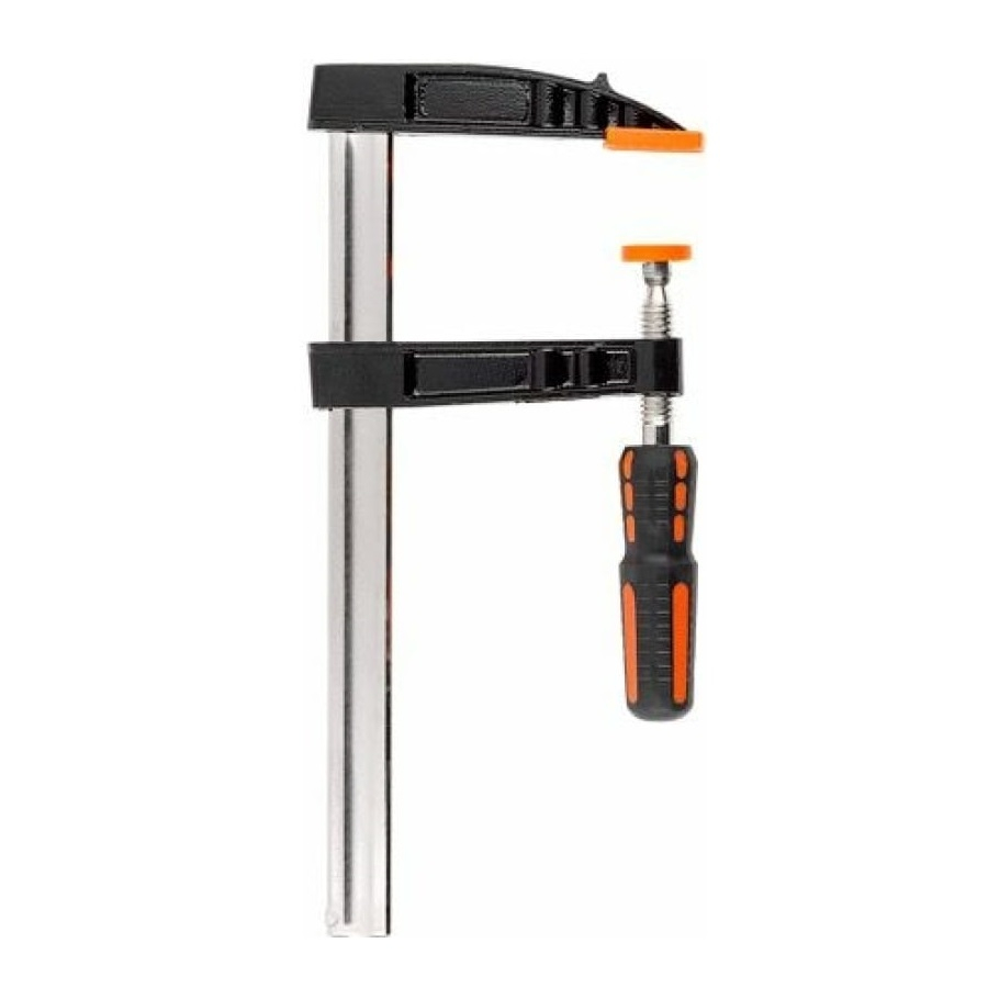 Есть защитные колпачки на губках для предотвращения повреждения детали. Обрезиненная рукоятка обеспечивает комфортный хват инструмента, а прочный алюминиевый корпус увеличивает срок службы струбцины.