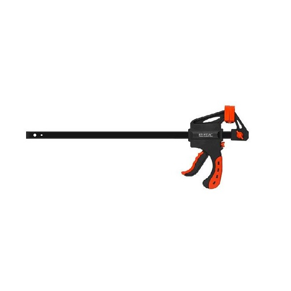 Струбцина пистолетная быстрозажимная STARTUL ST9024-35 применяется для надежной фиксации предметов во время склеивания, сборки или обработки. Ширина зажима 350 мм, глубина зажима 60 мм. Максимальное зажимное усиление 600 Н. Материал корпуса ударопрочный пластик, направляющей - сталь. Рабочие губки снабжены мягкими накладками для предотвращения повреждений обрабатываемых предметов. Опорная губка перемещается и фиксируется по всей длине направляющей при помощи рукоятки, а также может переставляться на другой конец направляющей, что позволяет использовать струбцину "на разжим".