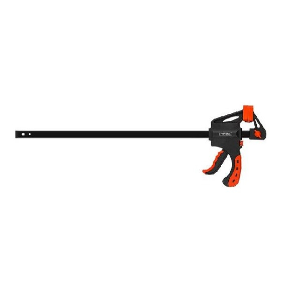 Струбцина пистолетная быстрозажимная STARTUL ST9024-45 применяется для надежной фиксации предметов во время склеивания, сборки или обработки. Ширина зажима 450 мм, глубина зажима 60 мм. Максимальное зажимное усиление 600 Н. Материал корпуса ударопрочный пластик, направляющей - сталь. Рабочие губки снабжены мягкими накладками для предотвращения повреждений обрабатываемых предметов. Опорная губка перемещается и фиксируется по всей длине направляющей при помощи рукоятки, а также может переставляться на другой конец направляющей, что позволяет использовать струбцину "на разжим".