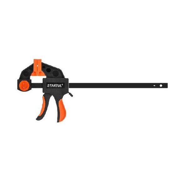 Струбцина пистолетная быстрозажимная STARTUL ST9026-25 применяется для надежной фиксации предметов во время склеивания, сборки или обработки. Ширина зажима 250 мм, глубина зажима 60 мм. Максимальное зажимное усиление 600 Н. Материал корпуса ударопрочный пластик, направляющей - сталь. Рабочие губки снабжены мягкими накладками для предотвращения повреждений обрабатываемых предметов. Опорная губка перемещается и фиксируется по всей длине направляющей при помощи рукоятки, а также может переставляться на другой конец направляющей, что позволяет использовать струбцину "на разжим".