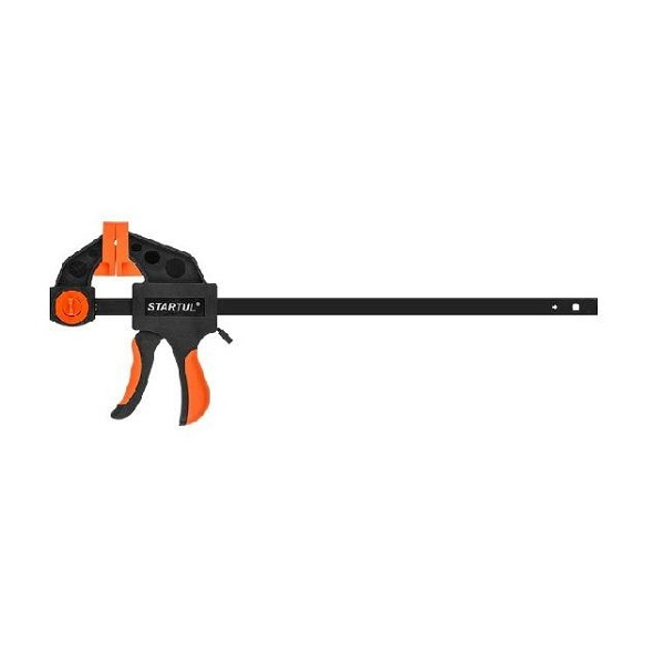 Струбцина пистолетная быстрозажимная STARTUL ST9026-30 применяется для надежной фиксации предметов во время склеивания, сборки или обработки. Ширина зажима 300 мм, глубина зажима 60 мм. Максимальное зажимное усиление 600 Н. Материал корпуса ударопрочный пластик, направляющей - сталь. Рабочие губки снабжены мягкими накладками для предотвращения повреждений обрабатываемых предметов. Опорная губка перемещается и фиксируется по всей длине направляющей при помощи рукоятки, а также может переставляться на другой конец направляющей, что позволяет использовать струбцину "на разжим".