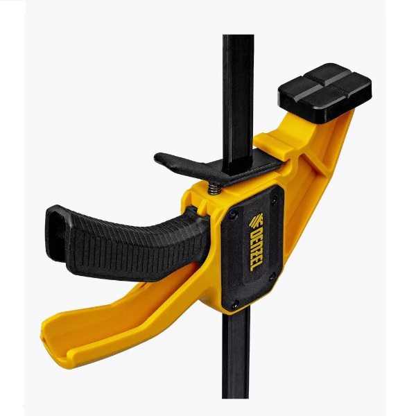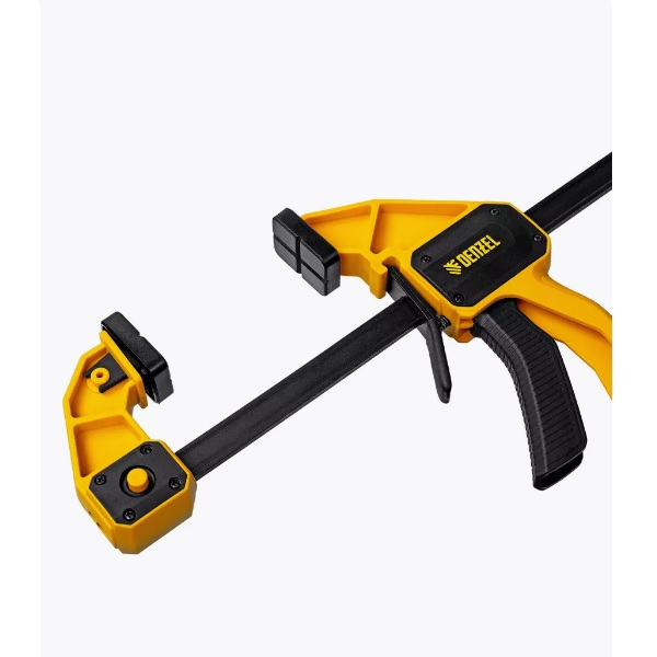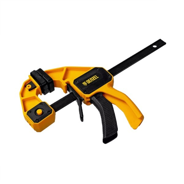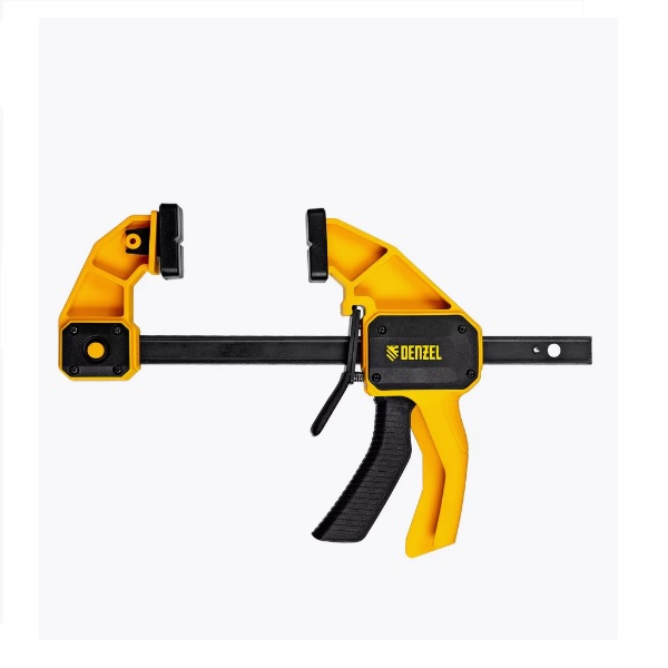 Струбцина Denzel F-образная подходит для бытового и профессионального применения. Переставные губки изделия позволяют использовать его на разжим. Обрезиненная кнопка фиксации обеспечивает удобный захват.