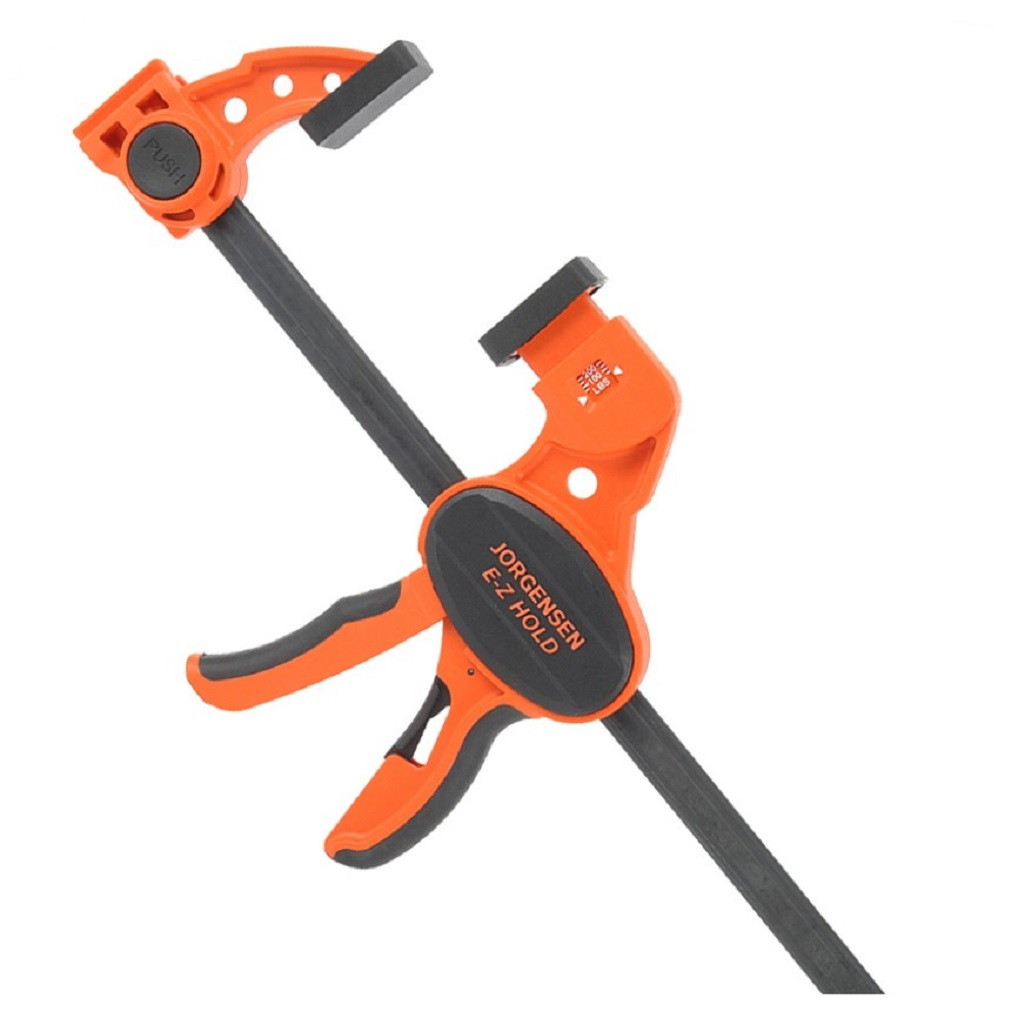 Струбцина Pony Jorgensen Medium-duty E-Z HOLD PJ33524, длина 609 мм предназначена для фиксации деталей с последующим проведением манипуляций над ними. Инструмент способен функционировать в режиме разжатия. Струбцина Pony Jorgensen Medium-duty E-Z предназначена для работы со средними нагрузками в деревообработке, хобби, ремесленных и модельных проектах. Запатентованная система Шип-Паз позволяет соединить две струбцины, создавая удлиненную модель с увеличенным расстоянием между губками без необходимости в дополнительных компонентах. Глубокие накладки обеспечивают максимальный захват заготовки. Быстрое зажимание достигается благодаря удобной рукоятке с курком, позволяющей перемещать зажим по направляющей шине. Струбцина Pony Jorgensen Medium-duty E-Z HOLD PJ33524 может быть трансформирована в распорный механизм.