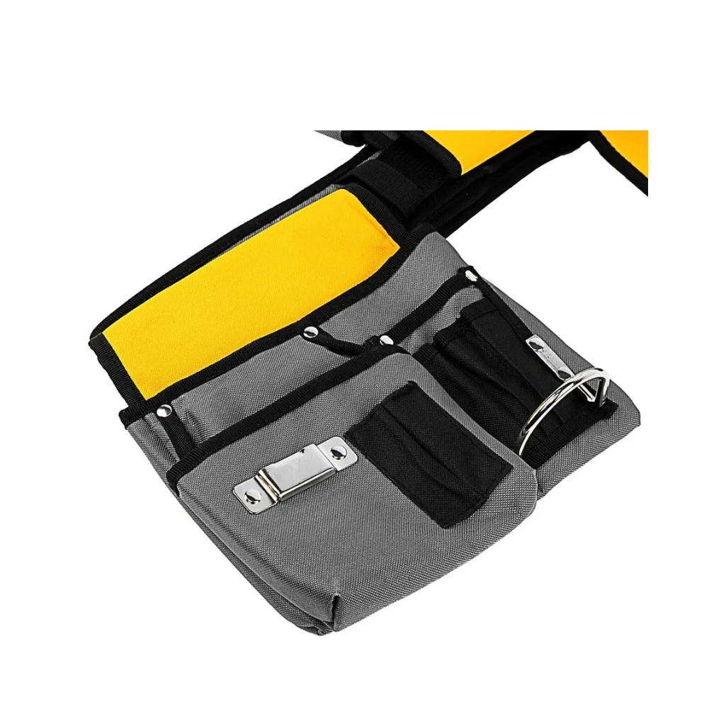 Надежное исполнение для фиксации карманов и сумки под нагрузкой. Сумка и отдельные карманы снимаются одним движением руки. Подсумки с ручками можно использовать отдельно. Металлическая скоба выполняет роль держателя для молотка. Ремень можно подогнать под обхват талии. Равномерное распределение веса нагруженной сумки.