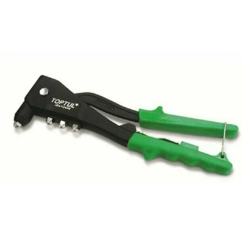Заклепочник Toptul JBAA2448 с мощными хром-молибденовыми рукоятками предназначен для скрепления деталей вытяжными заклепками. Для увеличения срока службы инструмента рама изготовлена из алюминия литого под давлением. Удобные эргономичные ручки обеспечивают комфорт при использовании. Заклепочник имеет 4 сменные насадки.