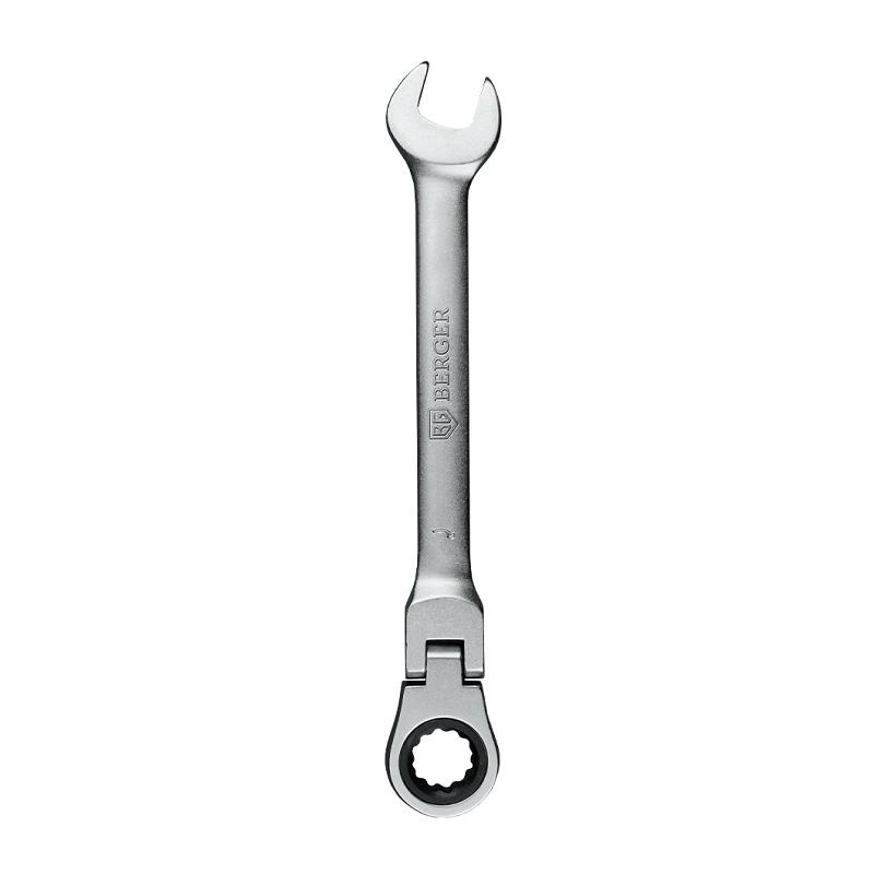 Ключ трещоточный с шарниром BERGER полностью выполнен из инструментальной хромванадиевой стали, с антикоррозийным покрытием «Satin» (матовый хром). Храповый механизм трещоточных ключей BERGER имеет: 72 зубца, изготовлен из хроммолибдена (Cr-Mo). Твердость материала храпового механизма: 58HRC. Шарнир (ход шарнира 180°) позволяет повысить функциональность ключа при работе в труднодоступных местах. Двухсторонняя маркировка ключа облегчает идентификацию.