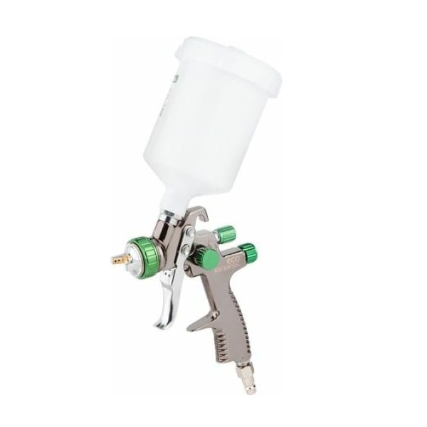 Достоинства LVLP (Low Volume Low Pressure - "низкий объём, низкое давление"): низкое потребление воздуха; высокий перенос материалов на окрашиваемую поверхность; низкая чувствительность к перепадам давления. Величина покрасочного пятна: 200-280 мм.