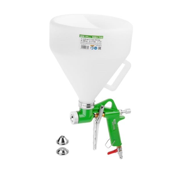 Краскораспылитель ECO SGH-710 предназначен для нанесения: декоративной (в т.ч. мраморной) штукатурки, огнезащитной декоративно-гидроизоляционной штукатурки, шпаклевочных масс, фасадных красок и жидких обоев, пробковых покрытий, огнеупорных и защитных материалов, жидких утеплителей, различных материалов, которые используются при текстурной отделке. Инструмент обеспечивает высокую экономию материалов. Краскораспылитель оснащен большим баком для распыляемого компонента - 5 литров. Конструкция распылителя предусматривает постоянное прохождение воздуха через сопло, даже при отпущенном курке, для того, что бы материал не засыхал. Класс инструмента полупрофессиональный.