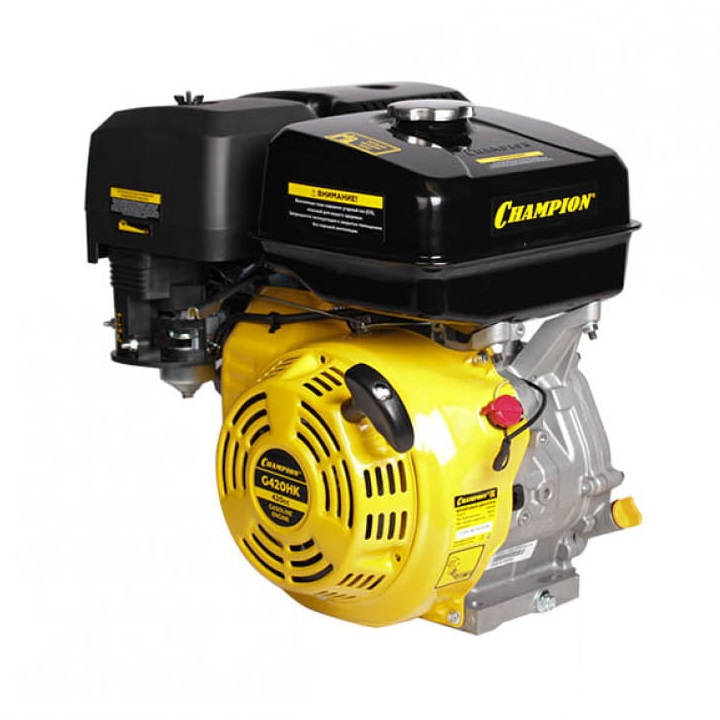 Champion G420HK четырёхтактный бензиновый двигатель с горизонтальным валом предназначен для установки в качестве привода на различную садово-парковую и иную технику: мотоблоки, мотокультиваторы, мотопомпы, снегоуборщики, виброплиты и т.д. Мощность двигателя 15 л.с., рабочий объём 420 см³, диаметр вала 25 мм (шпонка), масса 31 кг.