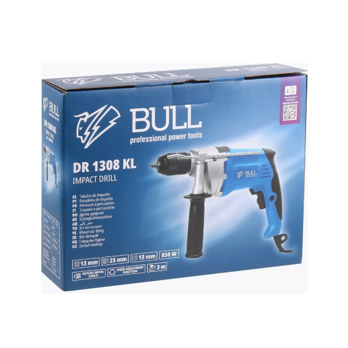 Дрель ударная BULL DR 1308 KL с двигателем мощностью 850 Вт и увеличенным ресурсом очень эффективна при сверлении в дереве или металле.