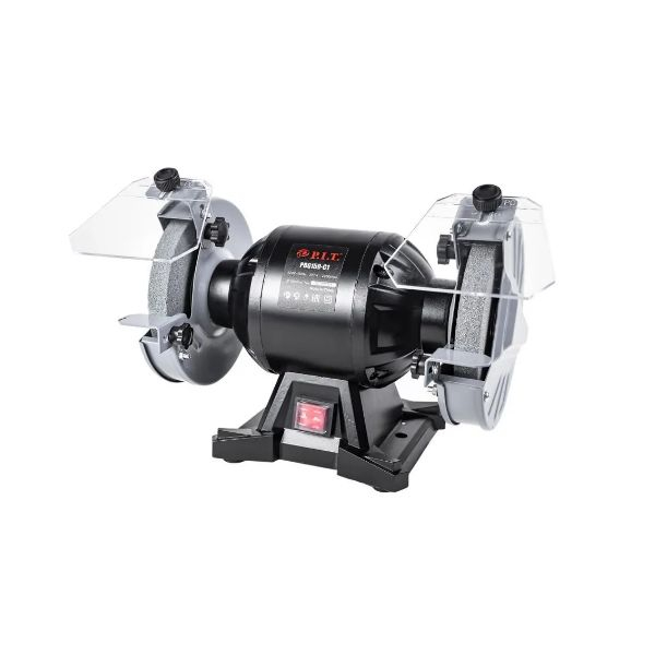Точильный станок используют в небольших мастерских для заточки слесарного и режущего инструмента, удаления слоев металла, сухого шлифования заготовок. Четыре резиновые опоры поглощает шум и снижают рабочие вибрации. С обеих сторон станка установлены прозрачные экраны для защиты от вылета искр и металлической стружки.